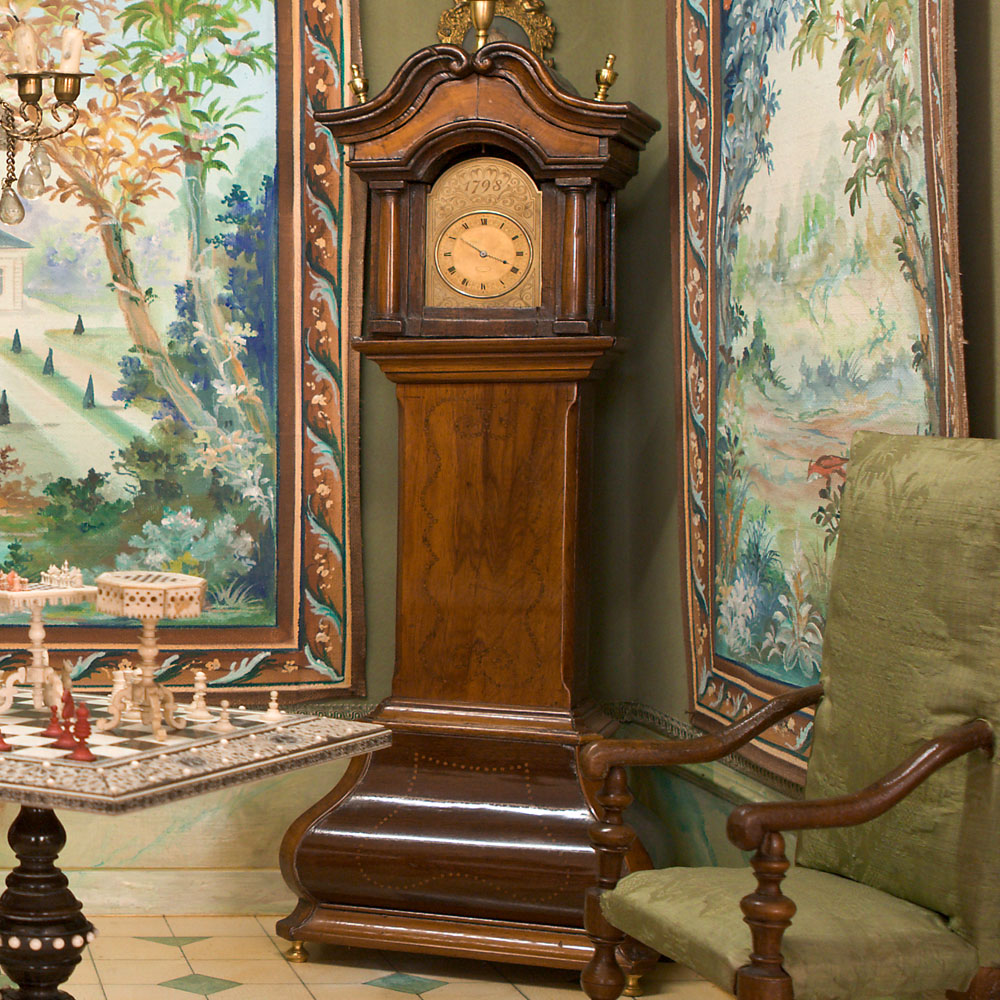 On y croise par exemple : des commodes en marqueterie de cubes du XVIIIᵉ siècle, des fauteuils d’époque Louis XV finement sculptés, des tableaux-horloges et objets à mécanismes, des cabinets inspirés des souvenirs du Grand Tour et des porcelaines et objets décoratifs venus d’Orient